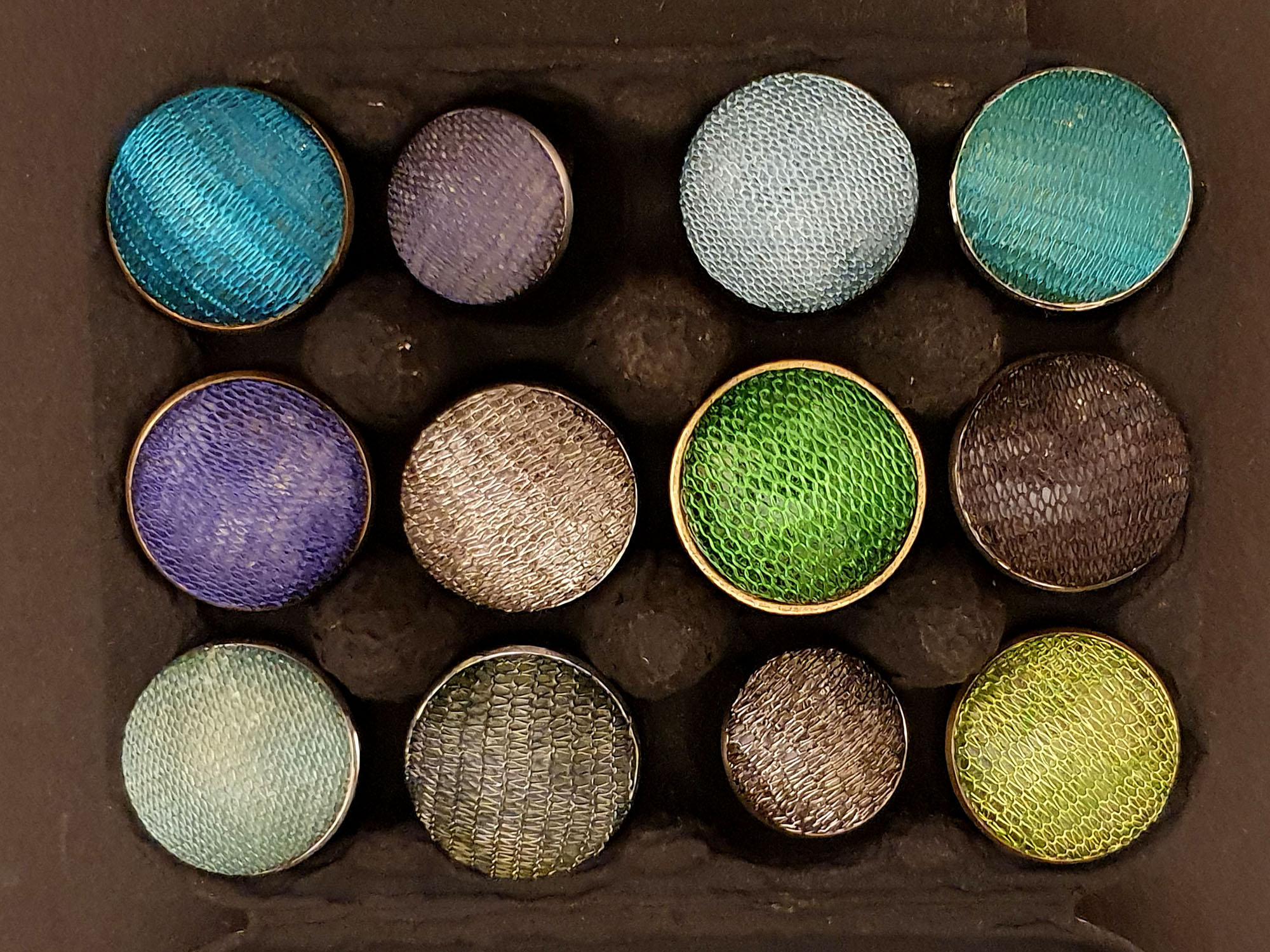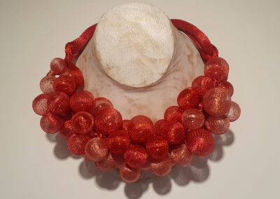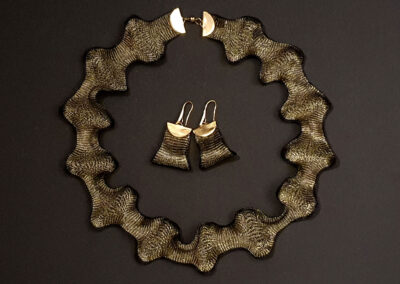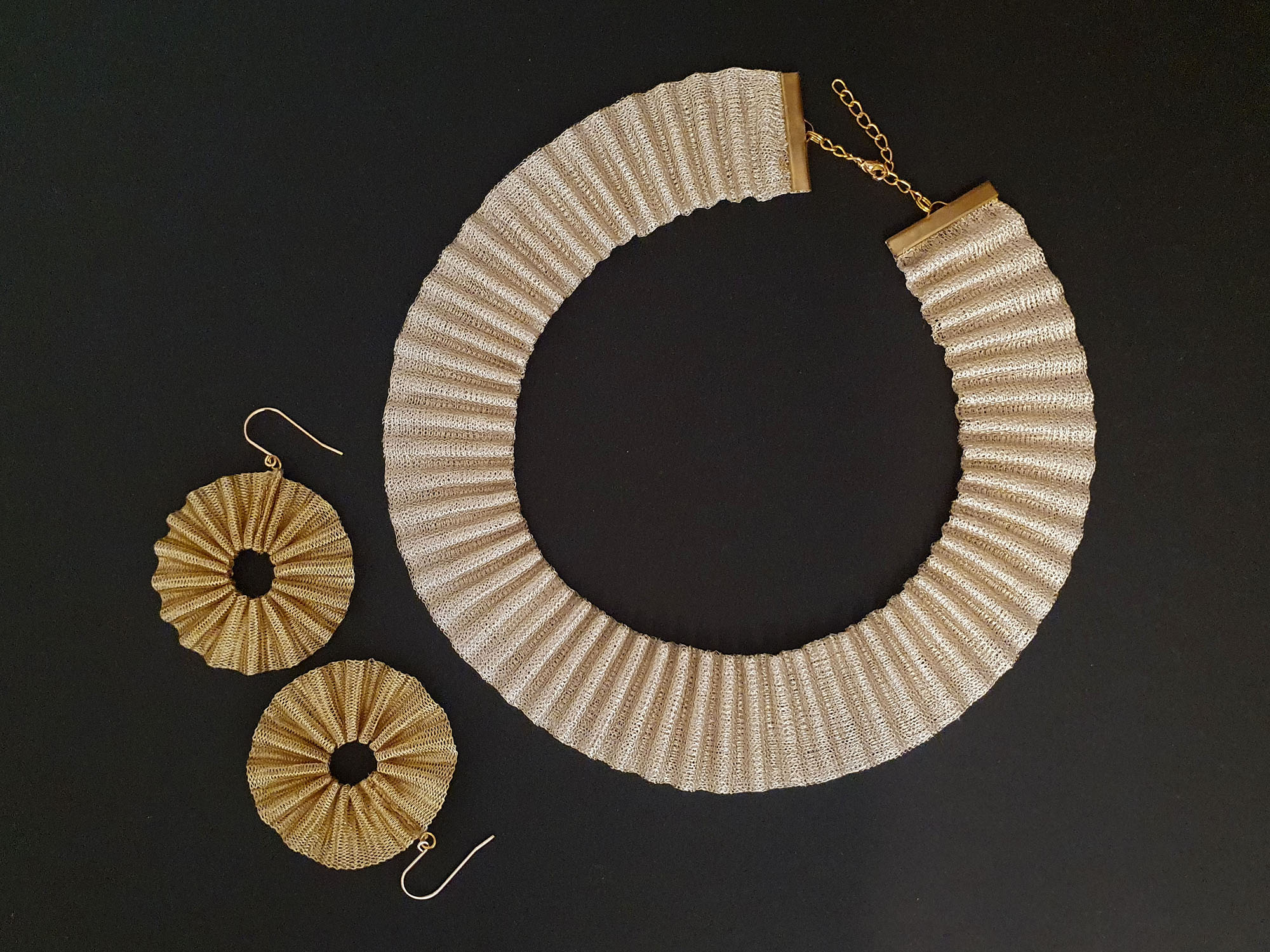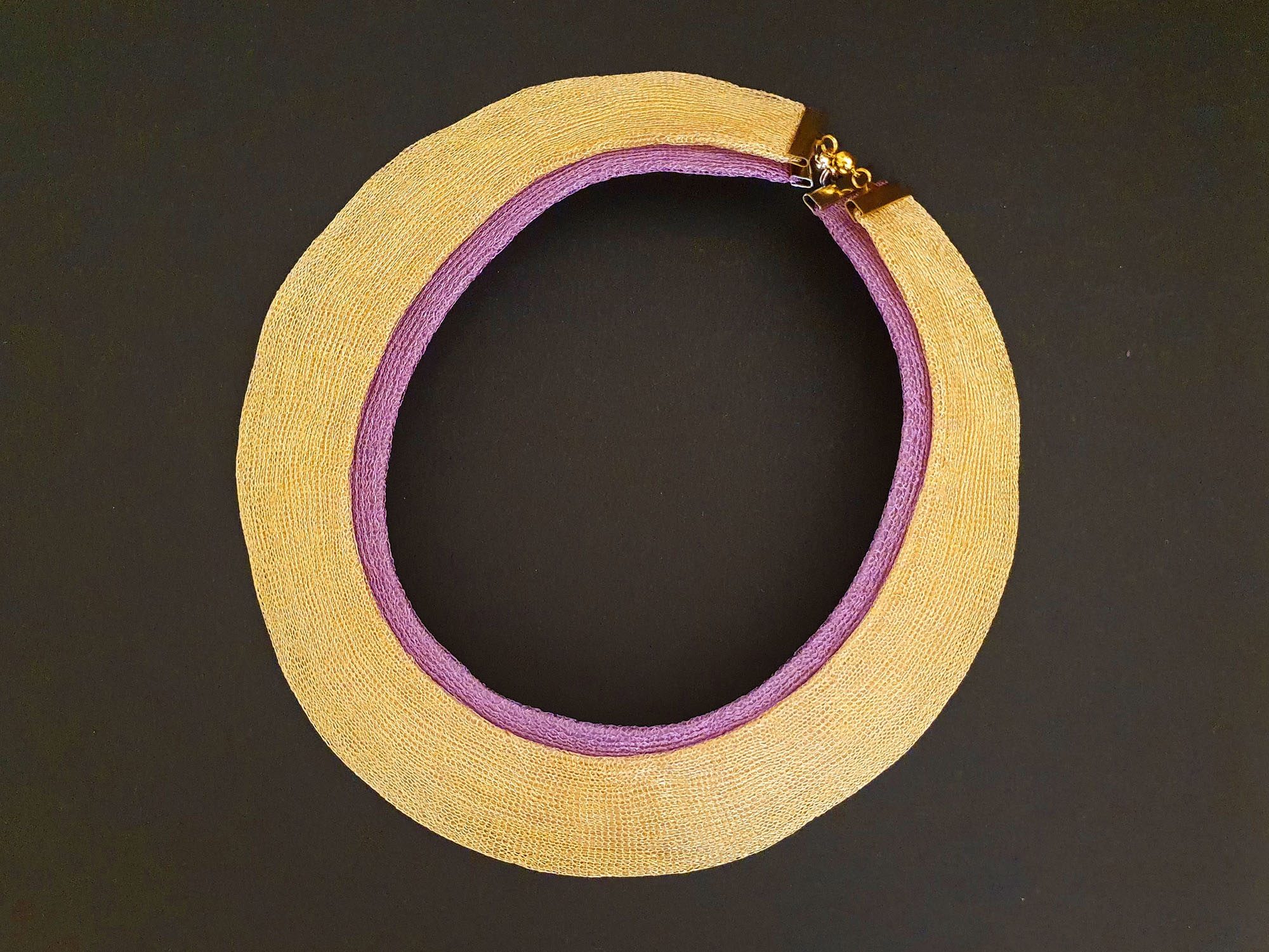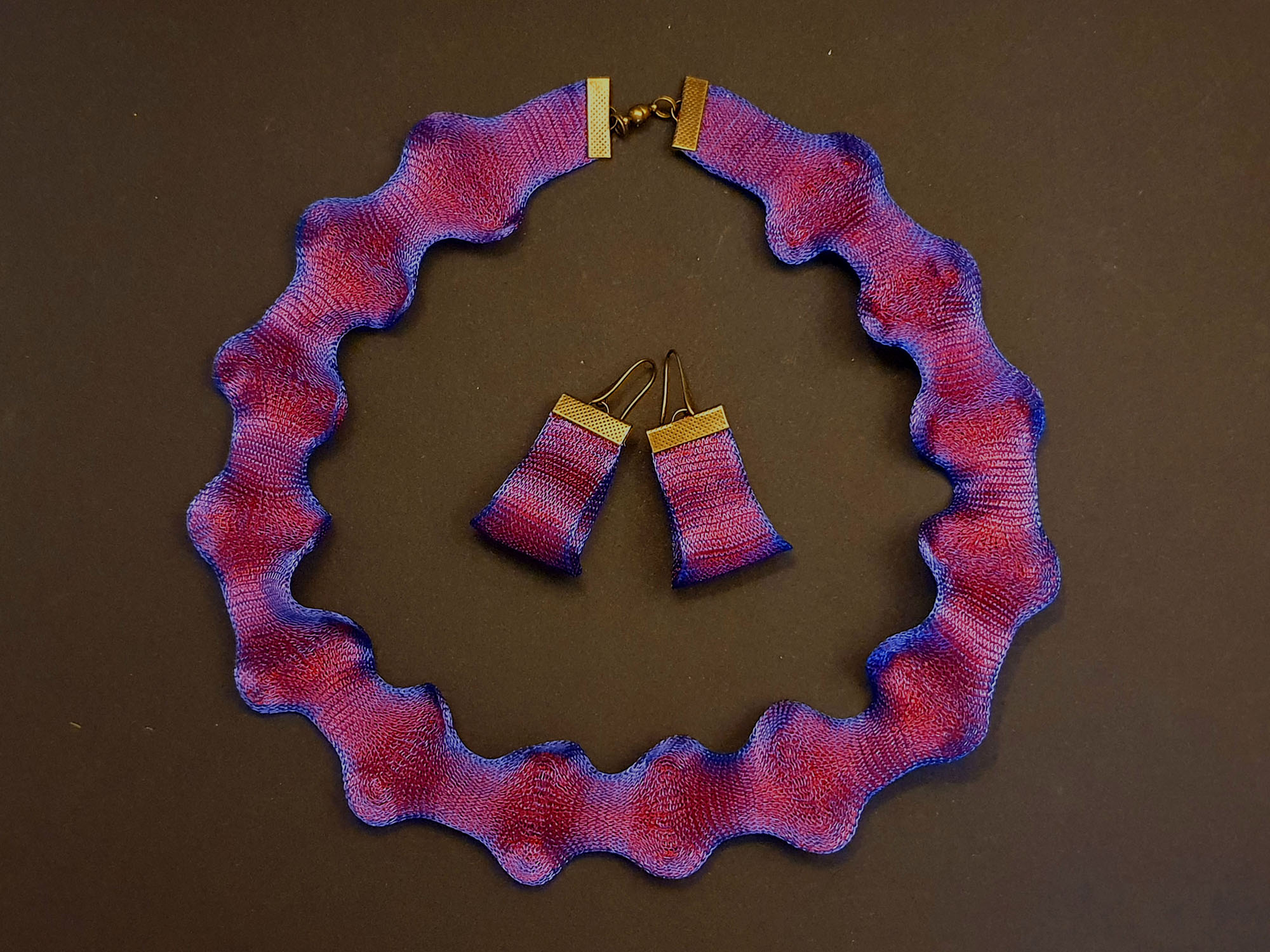 These necklaces, rings and earrings are made of Artistic Wire Mesh, a mesh made of galvanized titanium wire. This iridescent and shiny material adds a tender, filigree, light and enchanting character to my unique pieces and small series. The fine mesh fabric is combined with glass and metal elements.