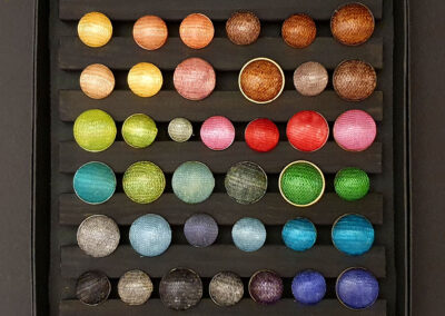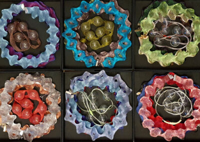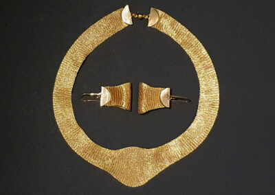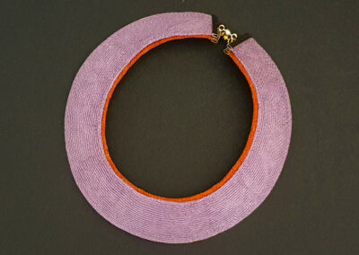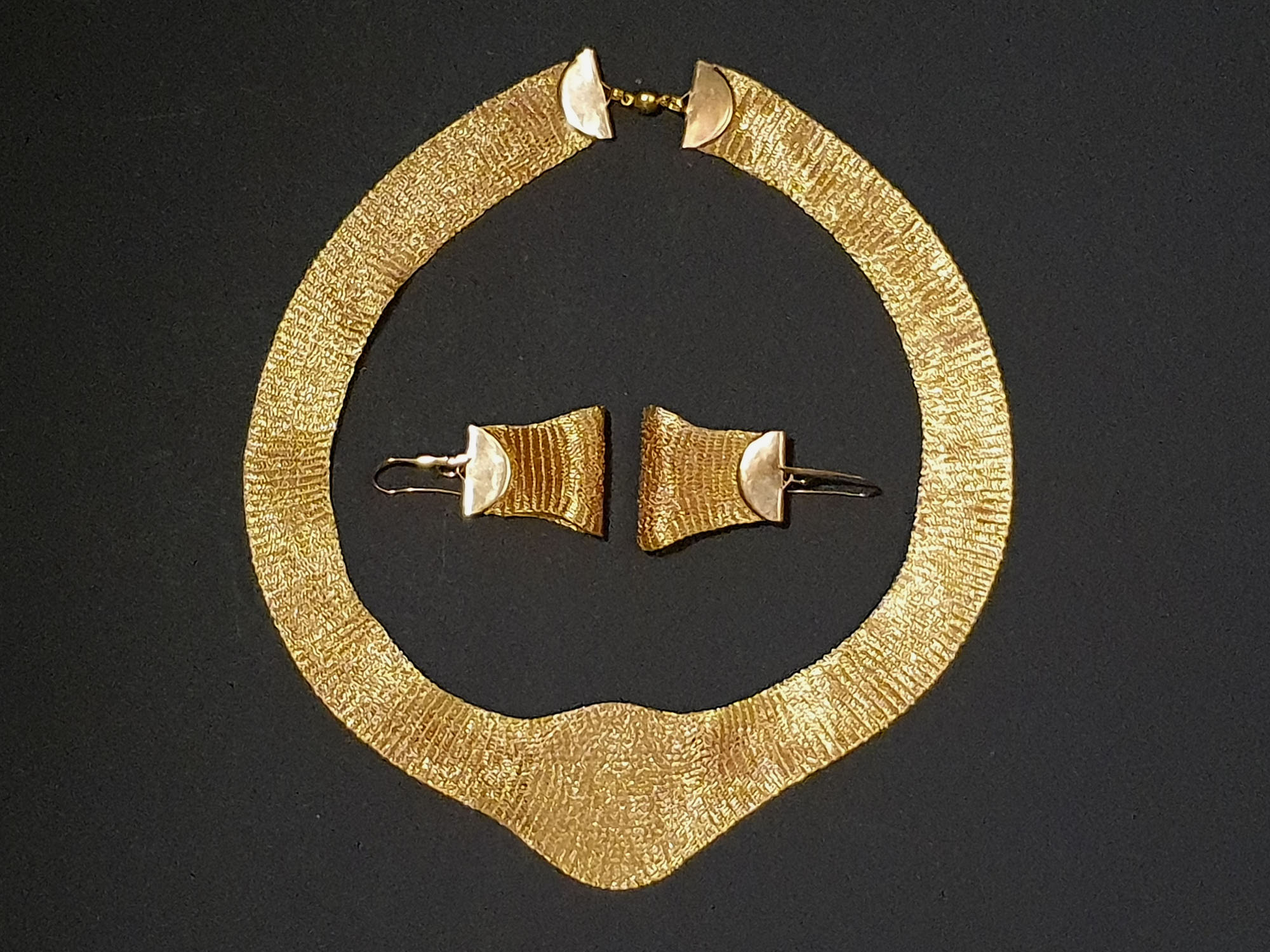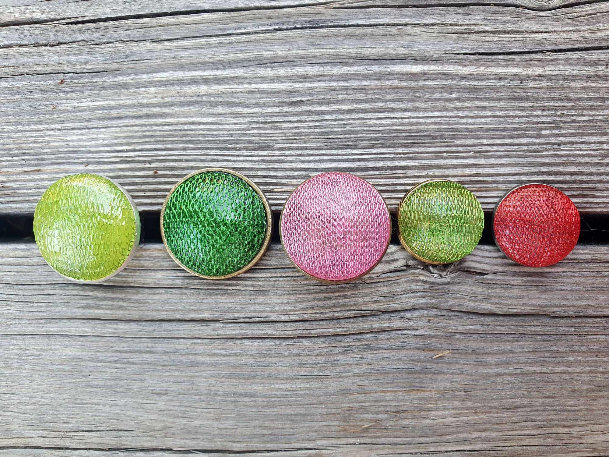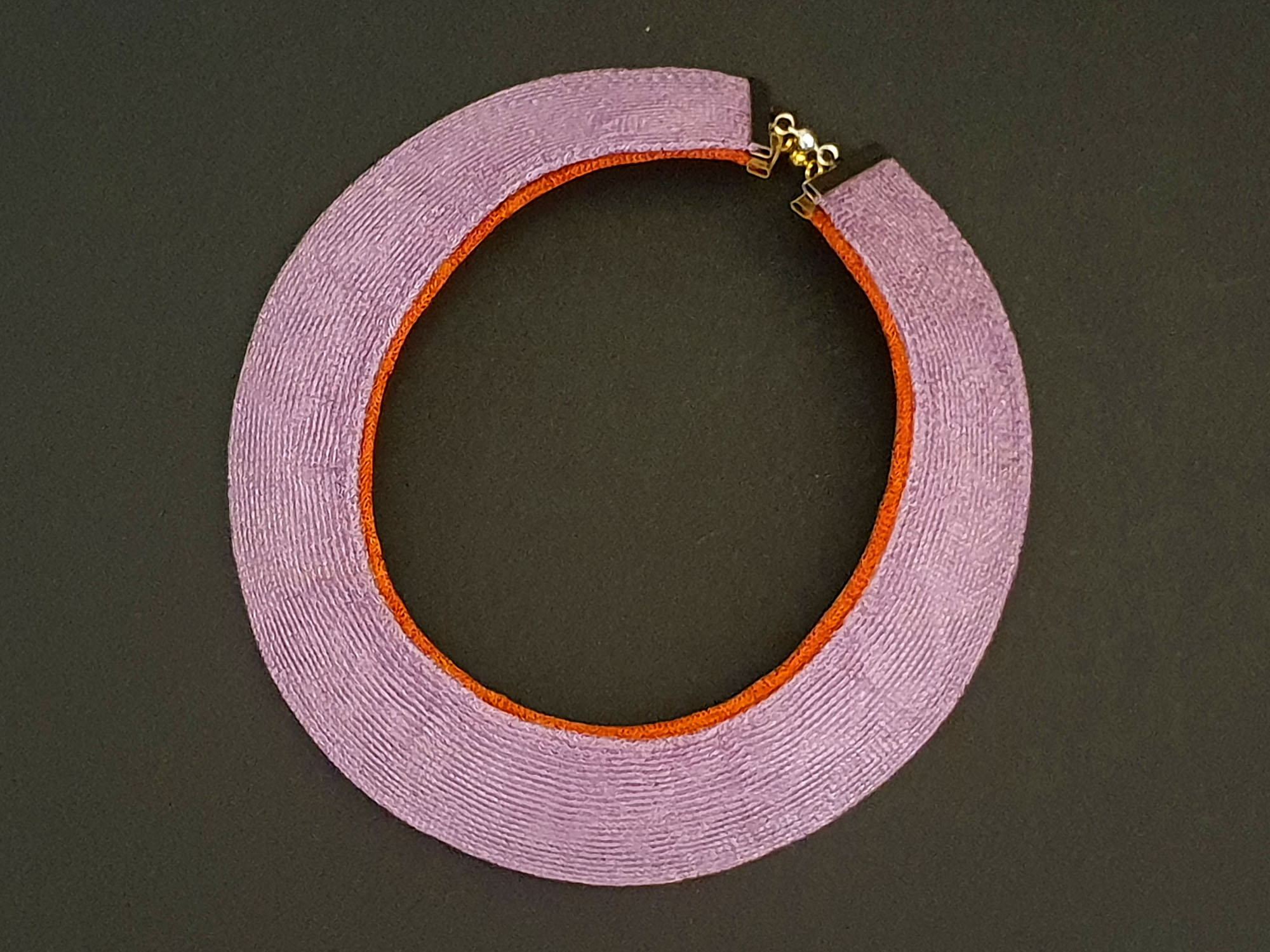 These necklaces, rings and earrings are made of Artistic Wire Mesh, a mesh made of galvanized titanium wire. This iridescent and shiny material adds a tender, filigree, light and enchanting character to my unique pieces and small series. The fine mesh fabric is combined with glass and metal elements.