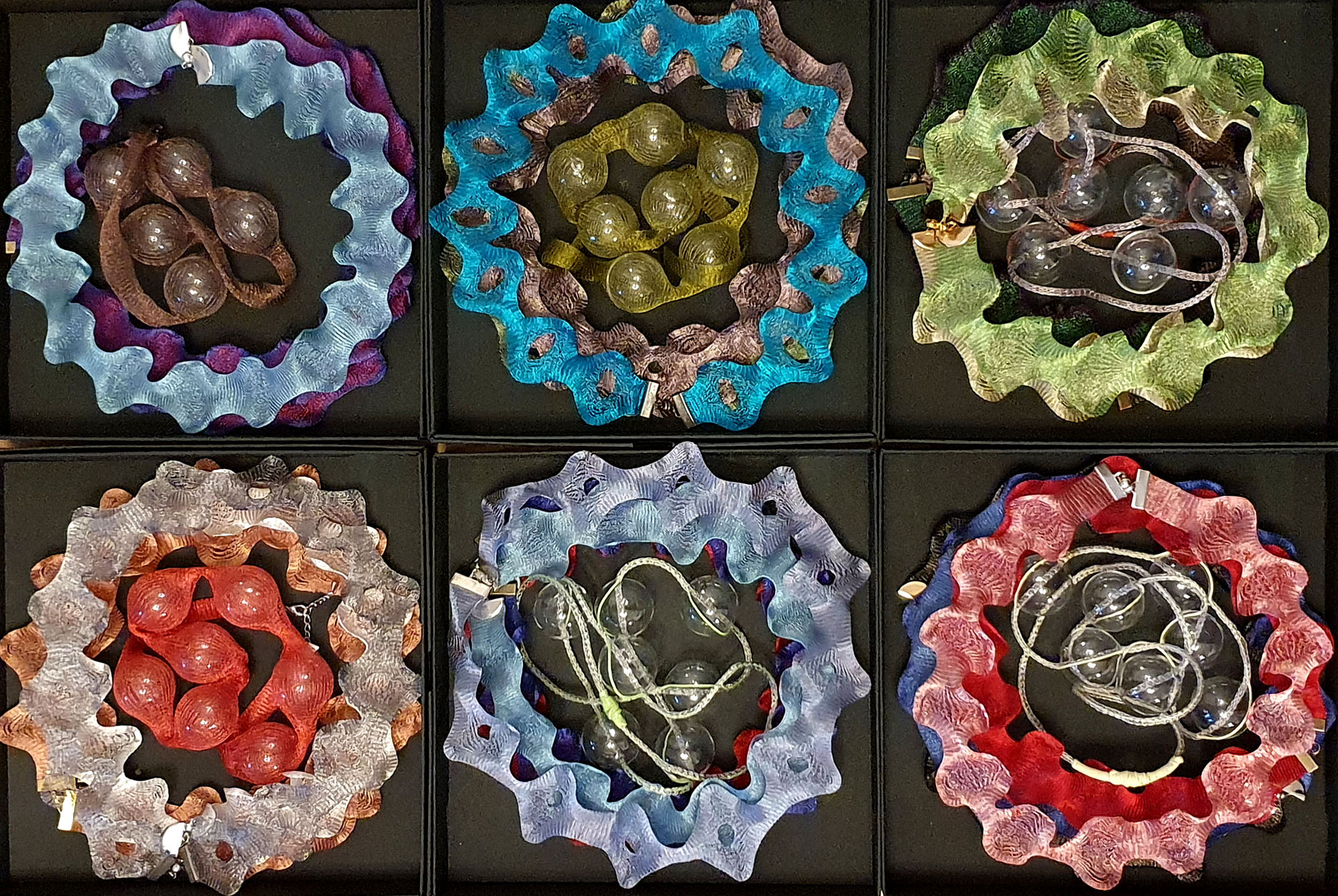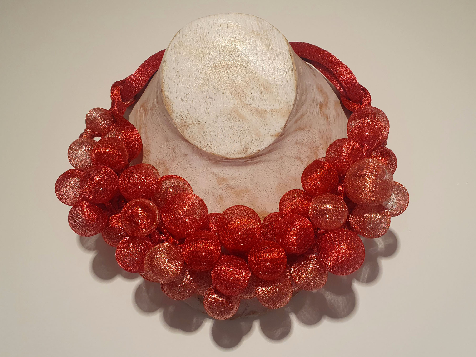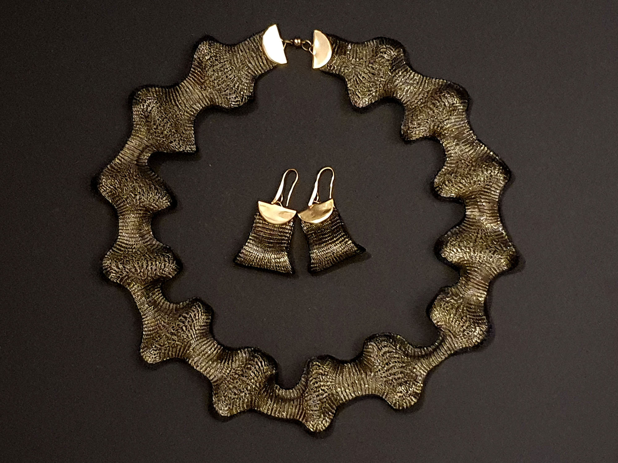 Diese Halsketten, Ringe und Ohrringe werden aus Artistic Wire Mesh, einem Draht-Maschenband aus galvanisiertem Titandraht, gefertigt. Das schillernd-glänzende Material verleiht den Schmuckunikaten und Kleinserien einen sehr zarten, filigranen, leichten und zauberhaft anmutenden Charakter. Kombiniert wird das feine Maschengewebe auch mit Elementen aus Glas und Metall.