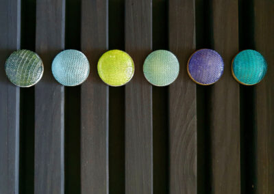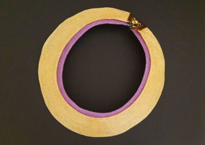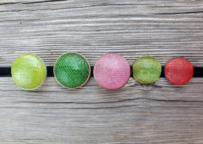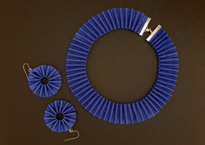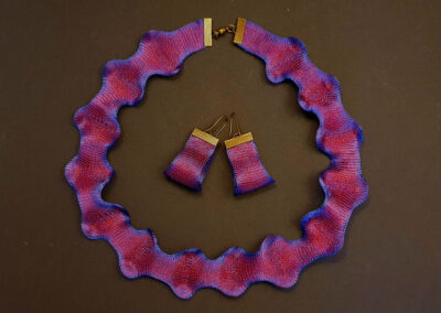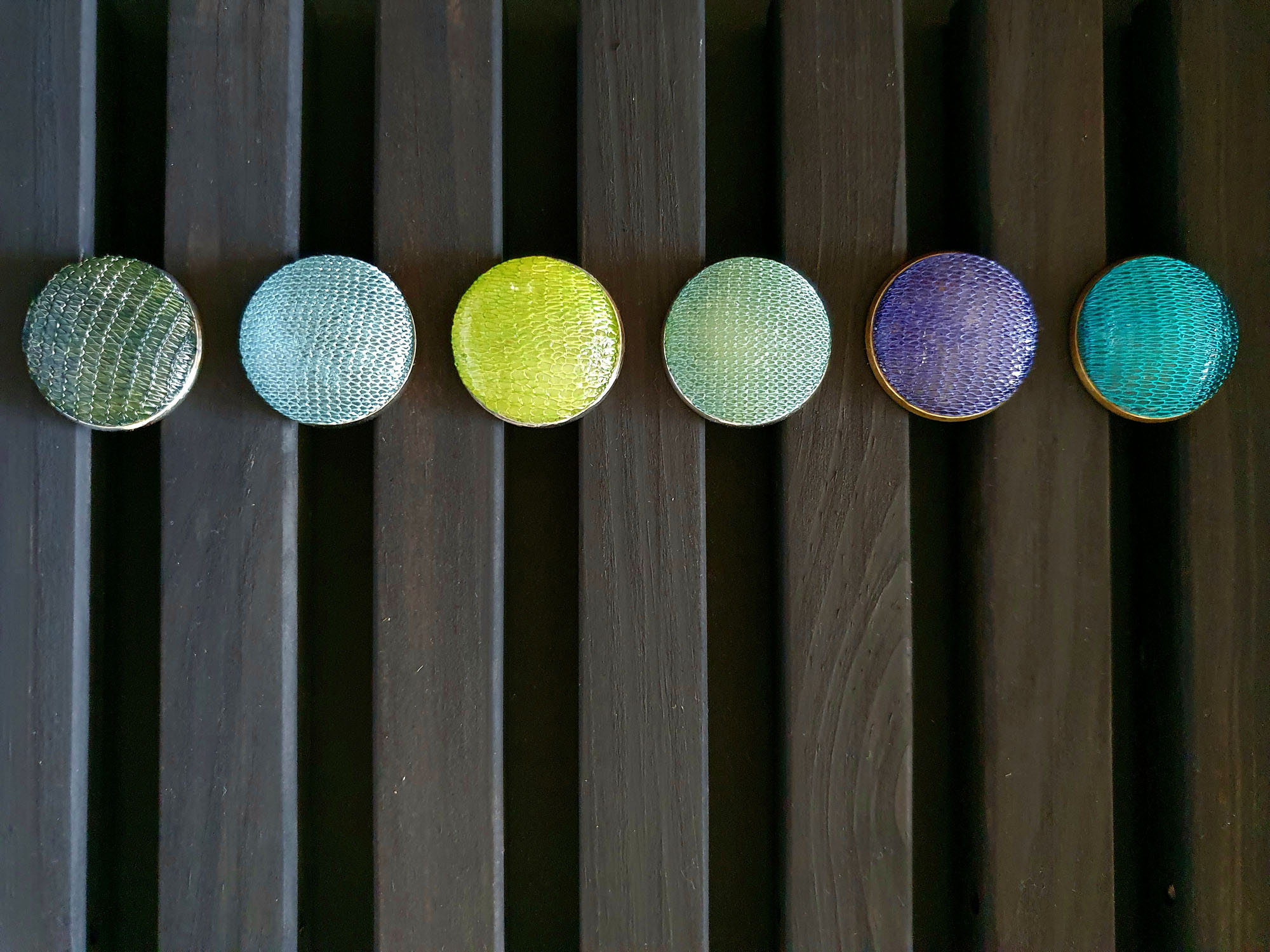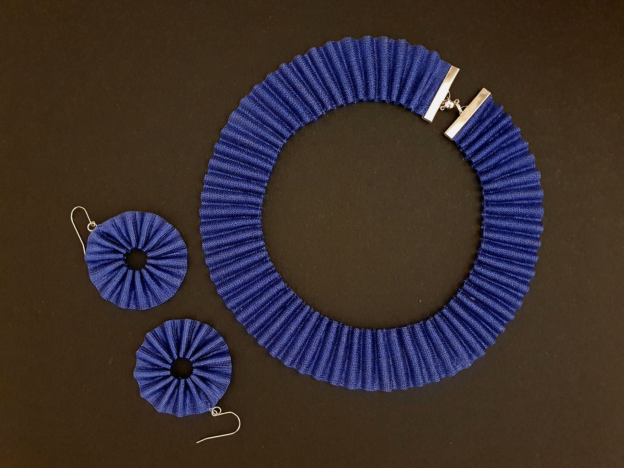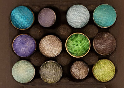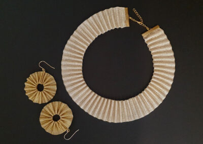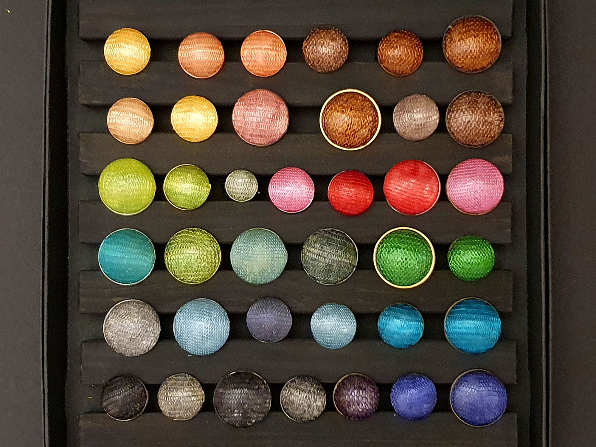 Diese Halsketten, Ringe und Ohrringe werden aus Artistic Wire Mesh, einem Draht-Maschenband aus galvanisiertem Titandraht, gefertigt. Das schillernd-glänzende Material verleiht den Schmuckunikaten und Kleinserien einen sehr zarten, filigranen, leichten und zauberhaft anmutenden Charakter. Kombiniert wird das feine Maschengewebe auch mit Elementen aus Glas und Metall.