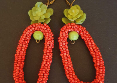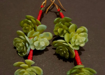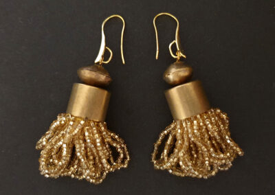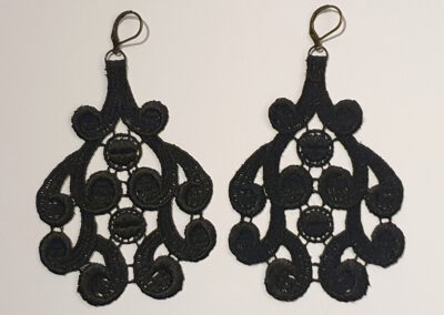 Das Potpourri an textilen Schmuckobjekten entsteht durch freudvolles Experimentieren und Kombinieren unterschiedlichster textiler Materialen, wie etwa Seide, Wolle, diverse Bänder, Garne, Schnüre, Quasten, Spitzen, textile Schläuche etc. und Techniken, wie etwa dem Weben, Fädeln, Knüpfen, Nähen, Drucken etc. Spannungsmoment ist dabei auch immer wieder das Aufeinandertreffen nicht-textiler Materialen, wie etwa Holz, Metall, Stein, Harz, Glas, Keramik, mit dem Textilen.